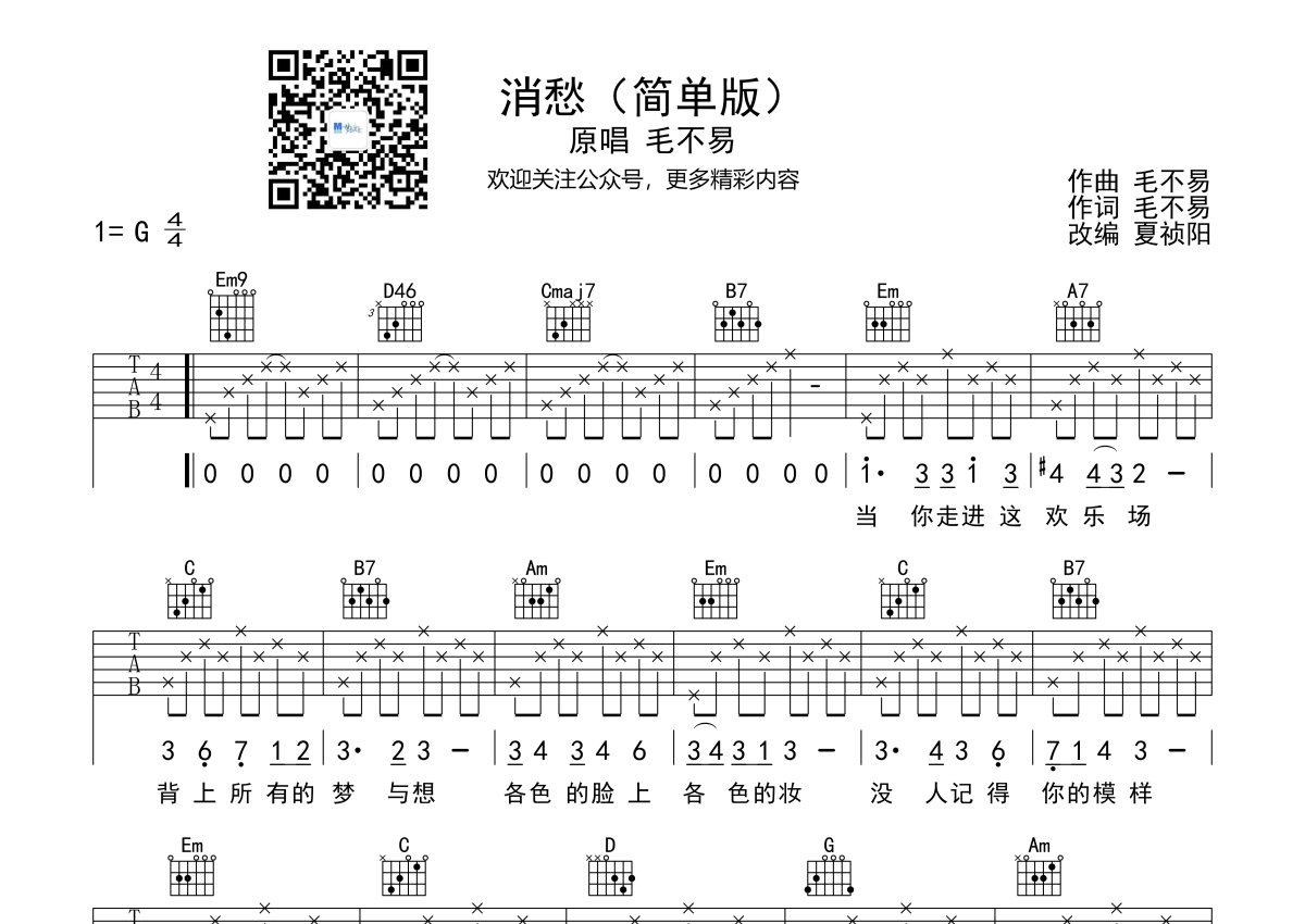 毛不易《消愁》吉他谱 - G调弹唱六线谱