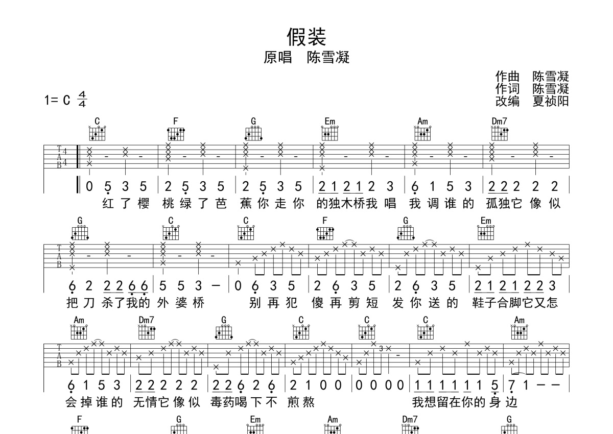 《假装》是陈雪凝演唱的一首歌曲,本吉他谱采用的是C调指法编配,这份吉他谱共有两张高清图谱,图谱由 @梦马音乐官方 编配上传,图谱使用六线谱编配,包含吉他和弦指法、简谱以及歌词部分,曲谱配备了相关的视频提供浏览,使用这份假装吉他谱,可以让你更加方便地掌握这首歌曲的弹唱技巧,快来尝试吧。汽水妹陈雪凝词曲创作演唱的一首忧伤歌曲,C调指法,高清弹唱谱,夏祯阳老师编配并带来《假装》吉他弹唱视频演示。要点讲解:整首歌曲的旋律和和弦都很简单,配合清澈的歌声,由一把吉他来表现也可以给人很好的感觉和效果。但是这首歌有一个很特别的地方,就是在三遍高潮部分采用的变奏的手法。前面节奏都是比较缓慢的低音浅唱,但是在整首歌最高潮的部分,用同样的旋律,却改编了节拍轻重拍的位置。把强拍改到了前面次抢拍的位置。最强有力的突出了最高潮的感觉。大家在演唱的时候要注意。变奏手法在流行音乐里面确实不常见。这也是我选择把这首新歌拿出来制作的原因。