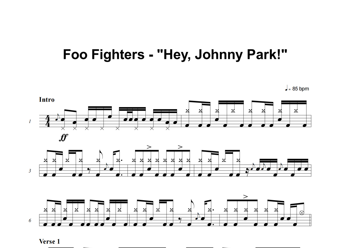 《Hey, Johnny Park!》是Foo Fighters演唱的一首歌曲,这份架子鼓谱共有五张高清图谱,图谱由 @举个例子 编配上传,图谱使用五线谱编配,使用这份Hey, Johnny Park!架子鼓谱,你将能够轻松地敲打出这首Foo Fighters的Hey, Johnny Park!,快来尝试吧。