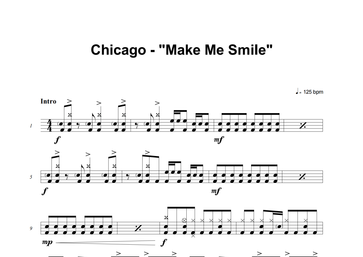 《Make Me Smile》是Chicago演唱的一首歌曲,这份架子鼓谱共有五张高清图谱,图谱由 @举个例子 编配上传,图谱使用五线谱编配,使用这份Make Me Smile架子鼓谱,你将能够轻松地敲打出这首Chicago的Make Me Smile,快来尝试吧。