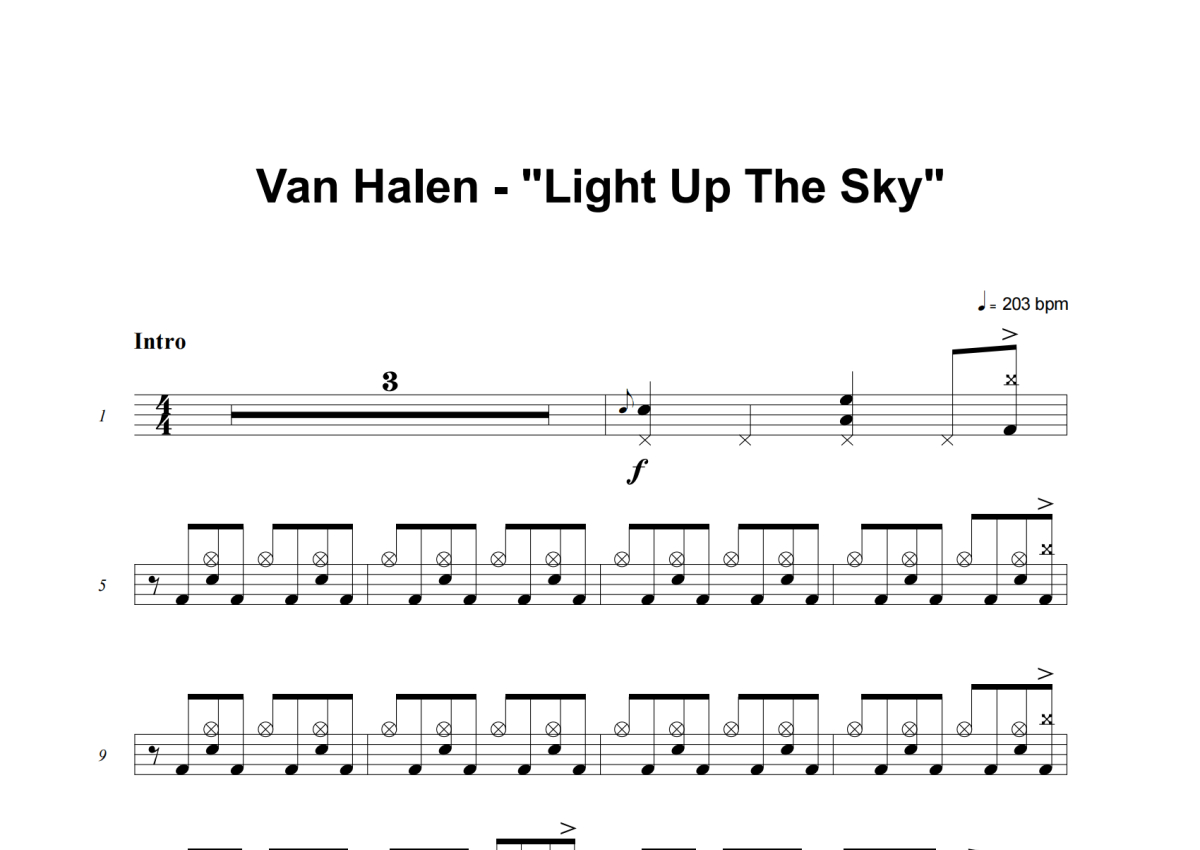 《Light Up The Sky》是Van Halen演唱的一首歌曲,这份架子鼓谱共有五张高清图谱,图谱由 @举个例子 编配上传,图谱使用五线谱编配,使用这份Light Up The Sky架子鼓谱,你将能够轻松地敲打出这首Van Halen的Light Up The Sky,快来尝试吧。