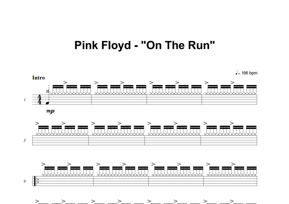 《On The Run》是Pink Floyd演唱的一首歌曲,这份架子鼓谱共有三张高清图谱,图谱由 @举个例子 编配上传,图谱使用五线谱编配,使用这份On The Run架子鼓谱,你将能够轻松地敲打出这首Pink Floyd的On The Run,快来尝试吧。