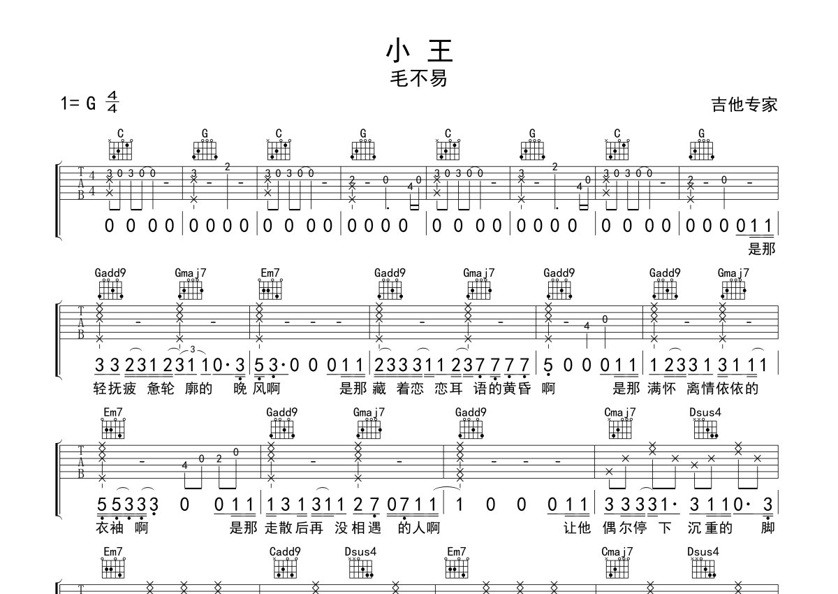 毛不易《小王》吉他谱 - G调弹唱六线谱