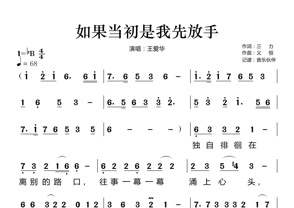 《如果当初是我先放手》是王爱华演唱的一首歌曲,拍号为4/4拍,歌曲速度为每分钟68拍,这份简谱共有两张高清图谱,图谱由 @音乐伙伴 编配上传。