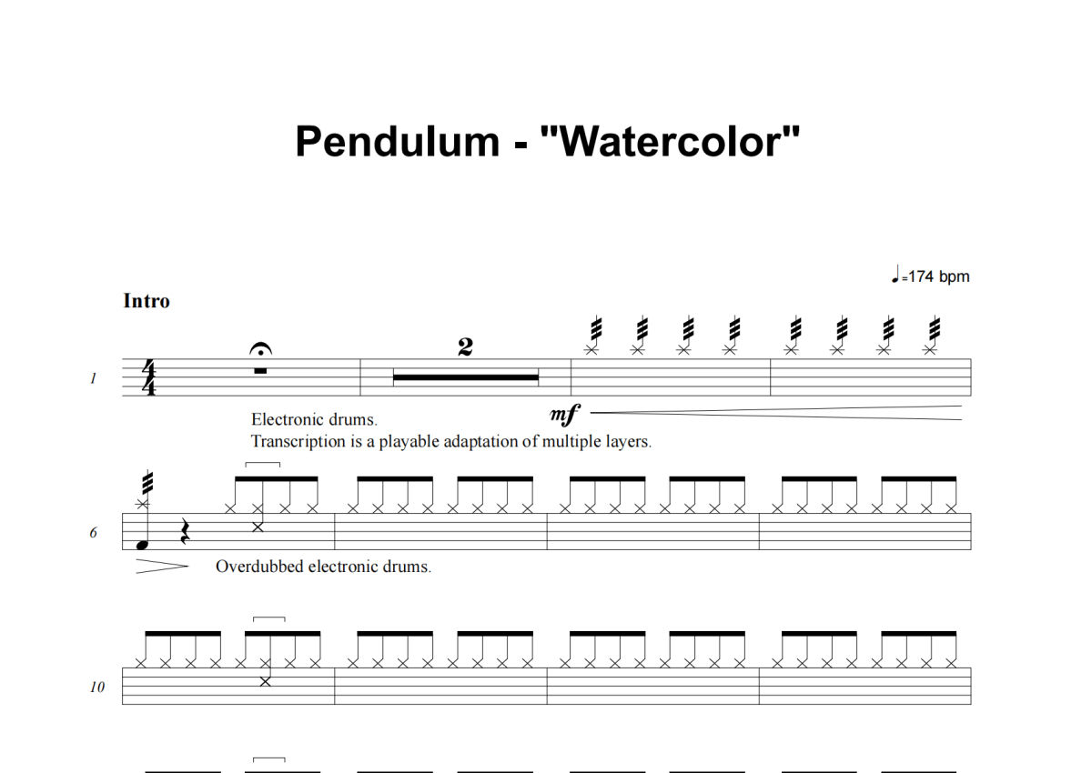 《Watercolour》是Pendulum演唱的一首歌曲,这份架子鼓谱共有六张高清图谱,图谱由 @失眠的土豆 编配上传,图谱使用五线谱编配,使用这份Watercolour架子鼓谱,你将能够轻松地敲打出这首Pendulum的Watercolour,快来尝试吧。