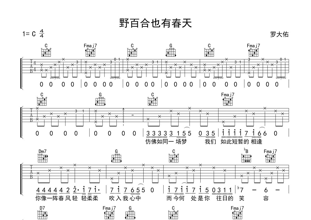 罗大佑《野百合也有春天》吉他谱 - C调弹唱六线谱