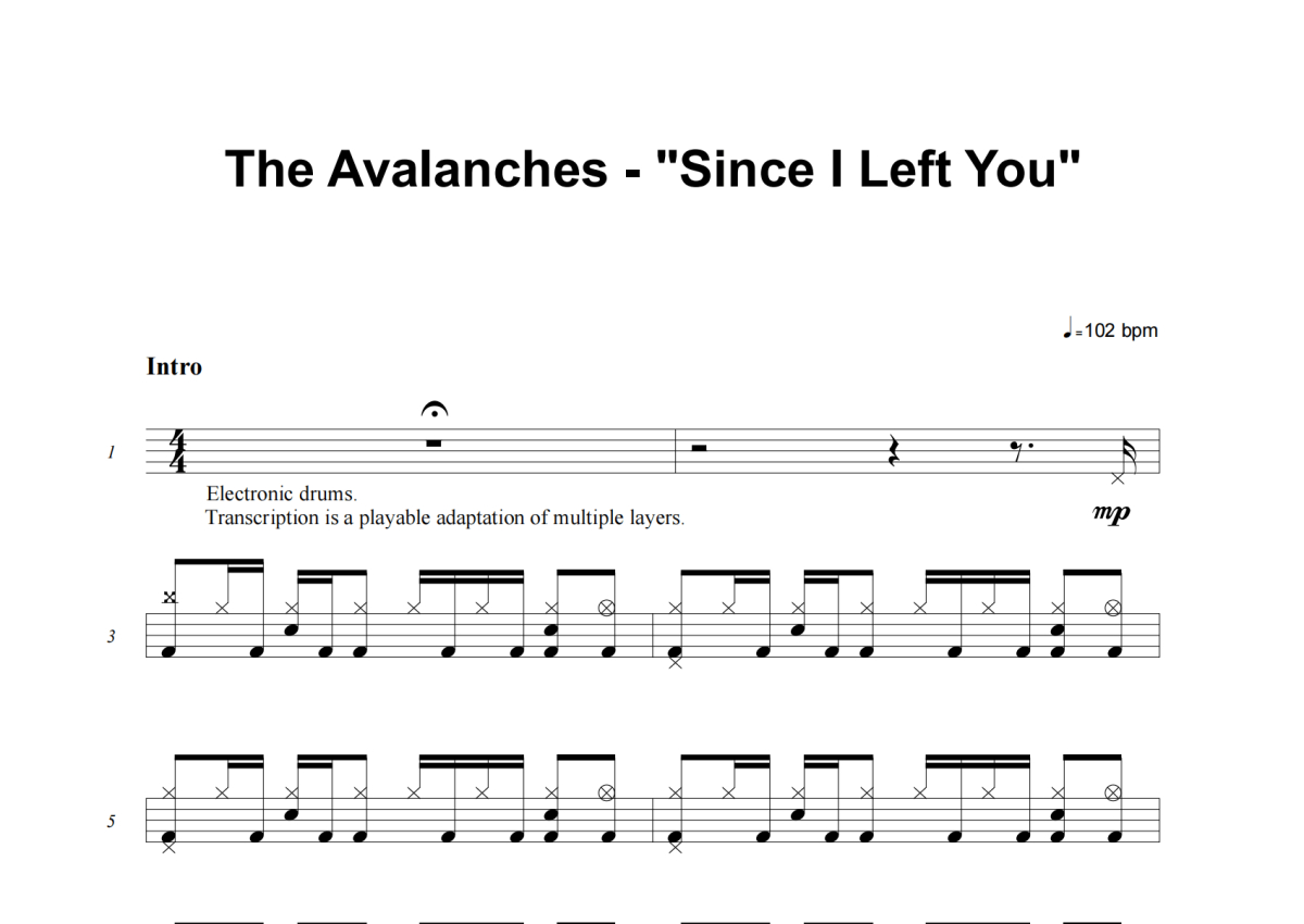 《Since I Left You》是The Avalanches演唱的一首歌曲,这份架子鼓谱共有七张高清图谱,图谱由 @失眠的土豆 编配上传,图谱使用五线谱编配,使用这份Since I Left You架子鼓谱,你将能够轻松地敲打出这首The Avalanches的Since I Left You,快来尝试吧。