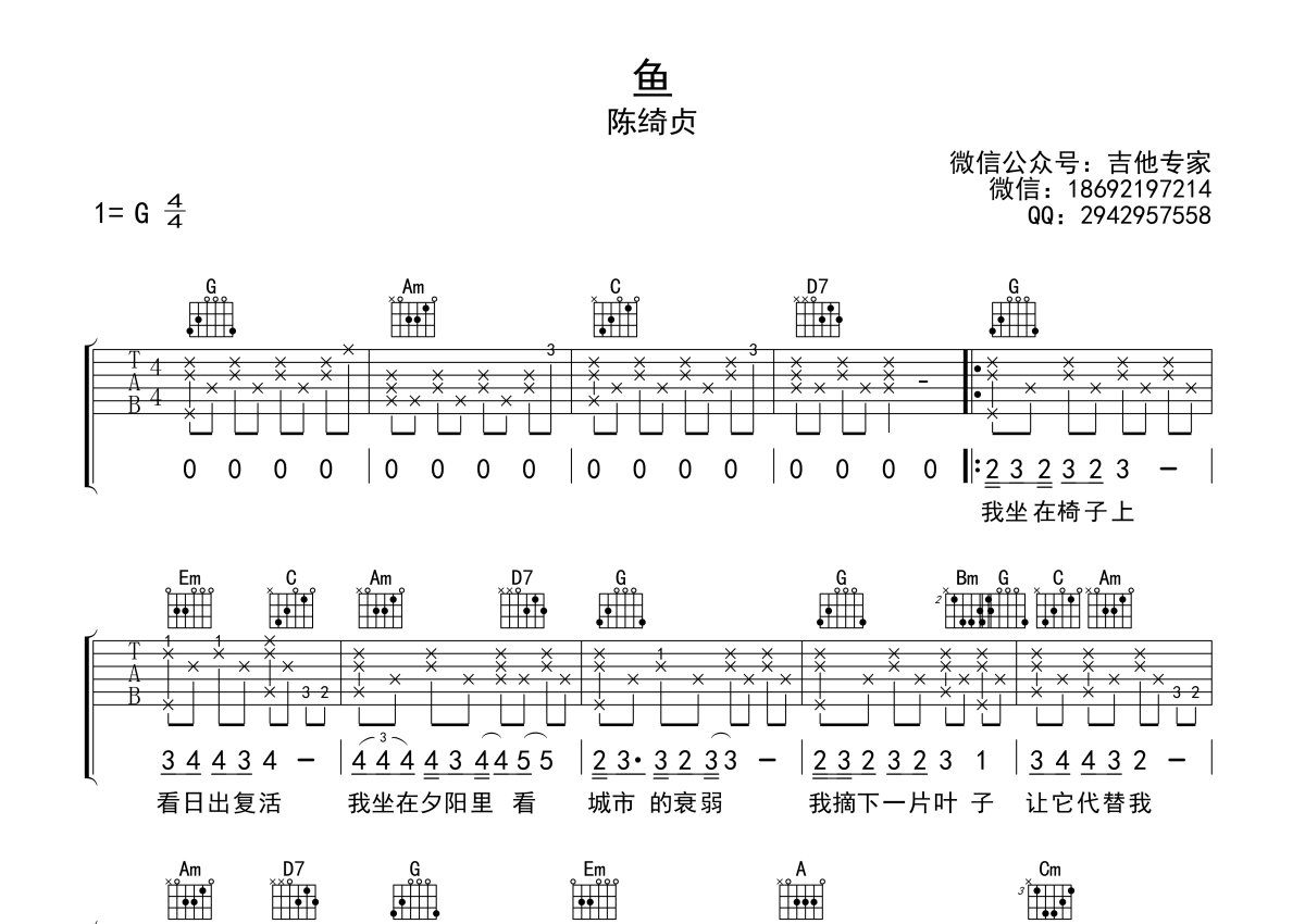 陈绮贞《鱼》吉他谱 - G调弹唱六线谱