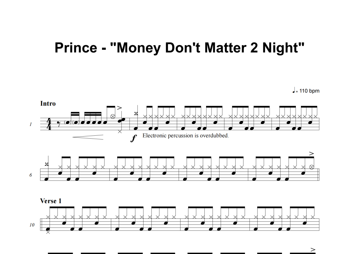 《Money Don't Matter 2 Night》是Prince演唱的一首歌曲,这份架子鼓谱共有四张高清图谱,图谱由 @失眠的土豆 编配上传,图谱使用五线谱编配,使用这份Money Don't Matter 2 Night架子鼓谱,你将能够轻松地敲打出这首Prince的Money Don't Matter 2 Night,快来尝试吧。