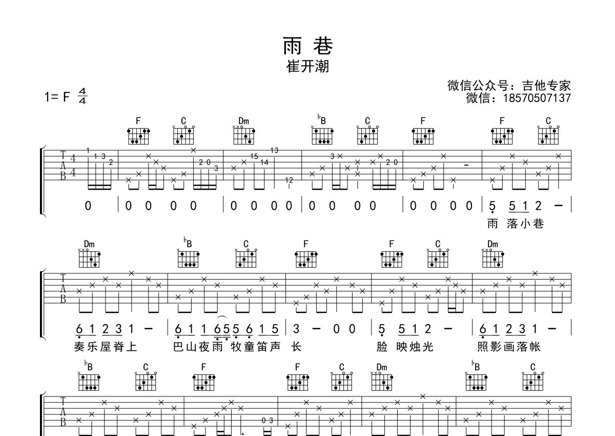 崔开潮《雨巷》吉他谱 - F调弹唱六线谱