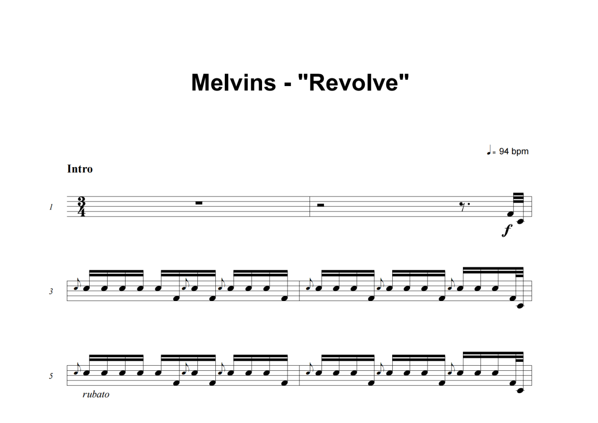 《Revolve》是Melvins演唱的一首歌曲,这份架子鼓谱共有七张高清图谱,图谱由 @失眠的土豆 编配上传,图谱使用五线谱编配,使用这份Revolve架子鼓谱,你将能够轻松地敲打出这首Melvins的Revolve,快来尝试吧。