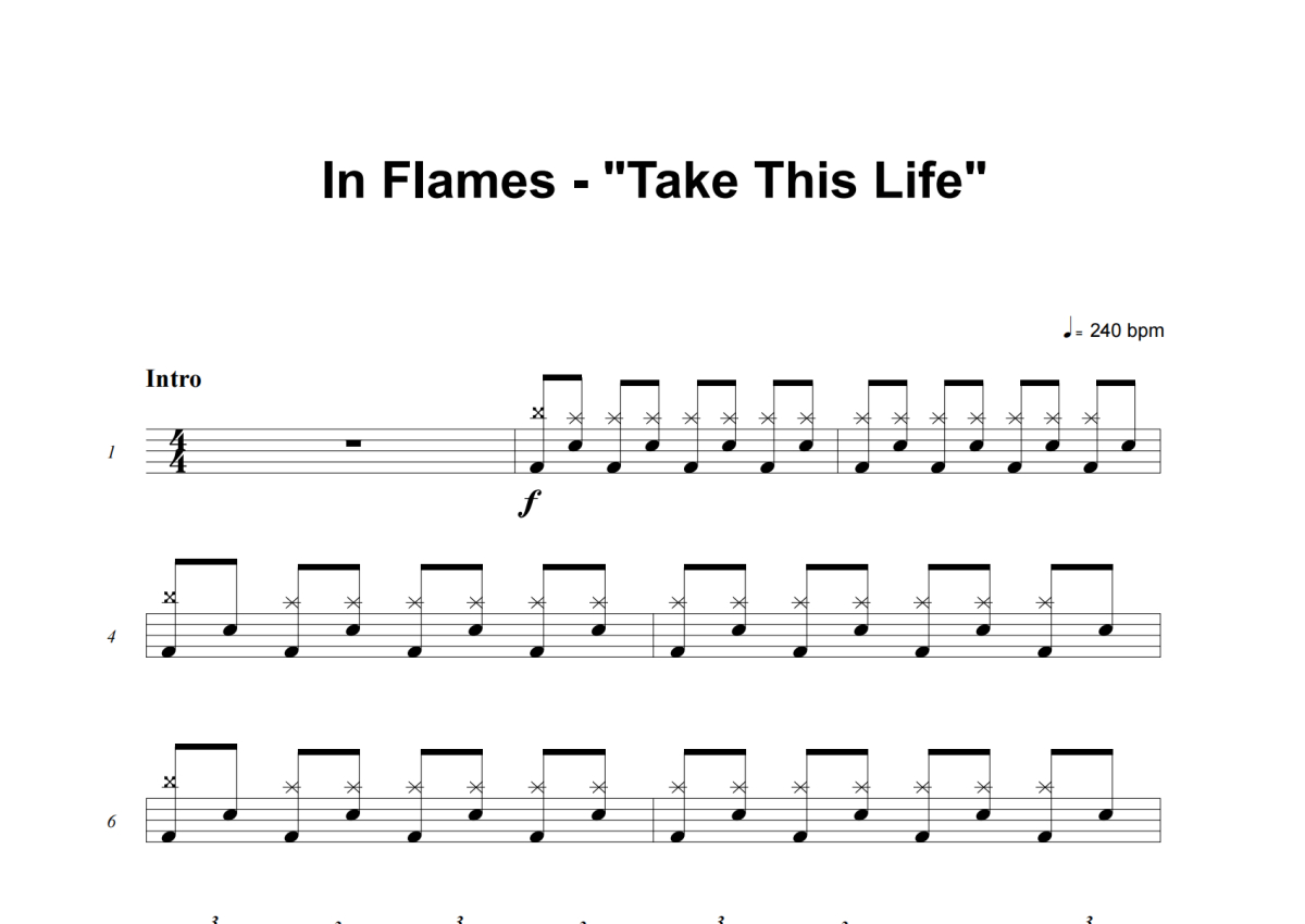 《Take This Life》是In Flames演唱的一首歌曲,这份架子鼓谱共有十二张高清图谱,图谱由 @失眠的土豆 编配上传,图谱使用五线谱编配,使用这份Take This Life架子鼓谱,你将能够轻松地敲打出这首In Flames的Take This Life,快来尝试吧。
