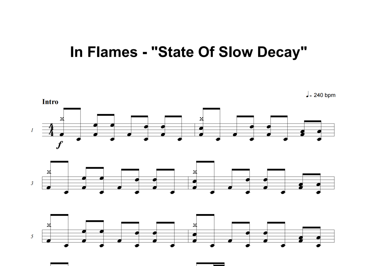《State Of Slow Decay》是In Flames演唱的一首歌曲,这份架子鼓谱共有十三张高清图谱,图谱由 @失眠的土豆 编配上传,图谱使用五线谱编配,使用这份State Of Slow Decay架子鼓谱,你将能够轻松地敲打出这首In Flames的State Of Slow Decay,快来尝试吧。