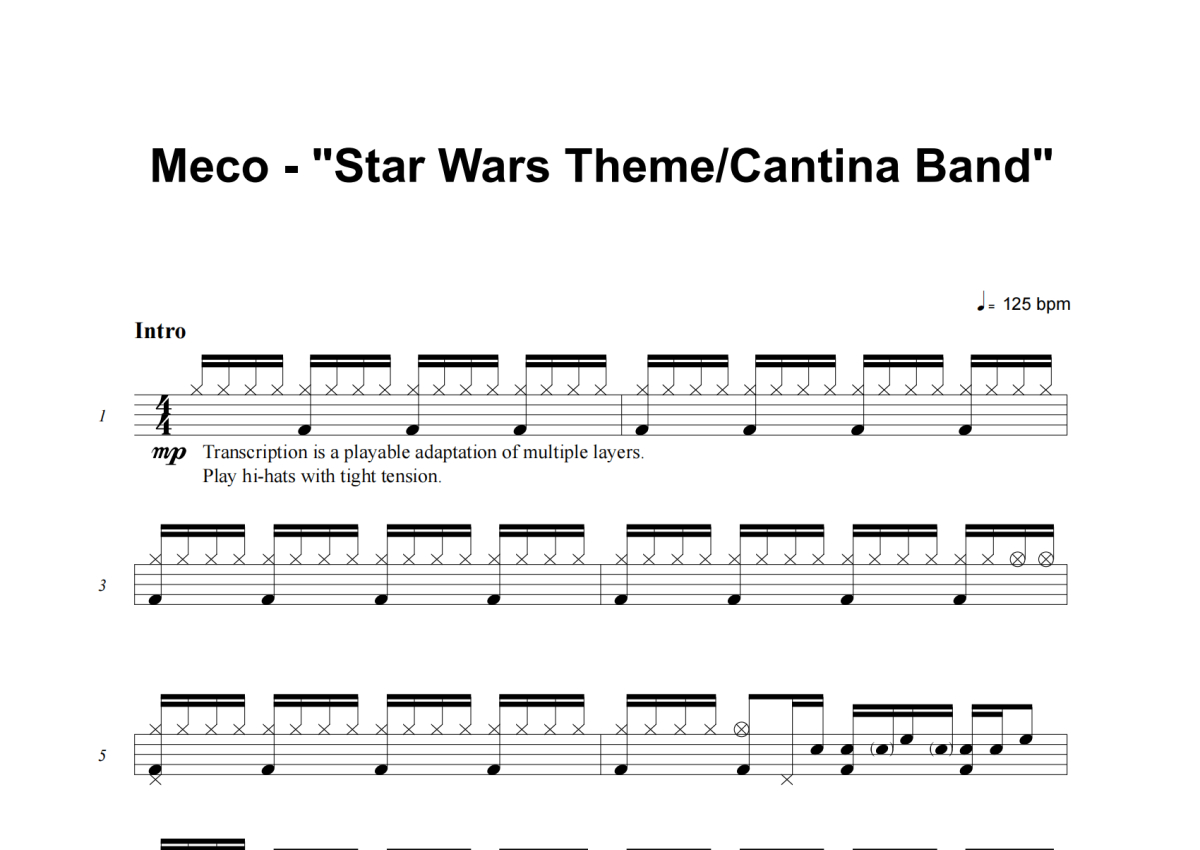 《Star Wars Theme_Cantina Band》是Meco演唱的一首歌曲,这份架子鼓谱共有七张高清图谱,图谱由 @失眠的土豆 编配上传,图谱使用五线谱编配,使用这份Star Wars Theme_Cantina Band架子鼓谱,你将能够轻松地敲打出这首Meco的Star Wars Theme_Cantina Band,快来尝试吧。