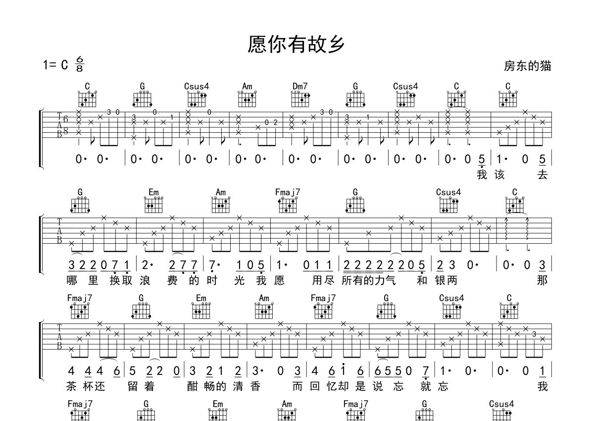 房东的猫《愿你有故乡》吉他谱 - C调弹唱六线谱