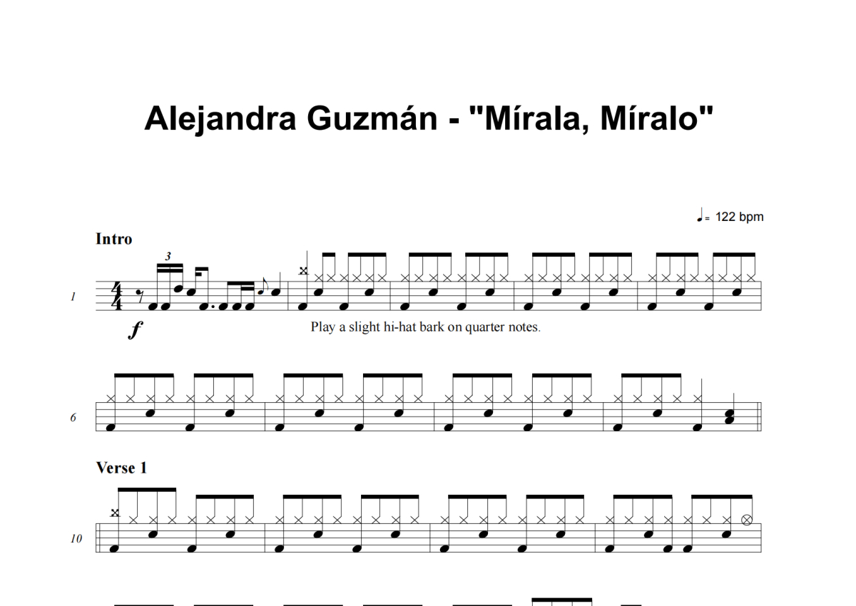 《Mírala, Míralo》是Alejandra Guzman演唱的一首歌曲,这份架子鼓谱共有四张高清图谱,图谱由 @失眠的土豆 编配上传,图谱使用五线谱编配,使用这份Mírala, Míralo架子鼓谱,你将能够轻松地敲打出这首Alejandra Guzman的Mírala, Míralo,快来尝试吧。
