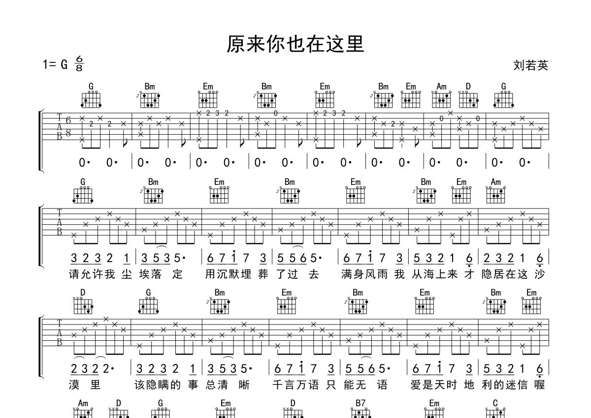 《原来你也在这里》是刘若英演唱的一首歌曲,本吉他谱采用的是G调指法编配,这份吉他谱共有一张高清图谱,图谱由 @吉他专家 编配上传,图谱使用六线谱编配,包含吉他和弦指法、简谱以及歌词部分,使用这份原来你也在这里吉他谱,可以让你更加方便地掌握这首歌曲的弹唱技巧,快来尝试吧。刘若英《原来你也在这里》吉他谱_G调吉他弹唱谱。