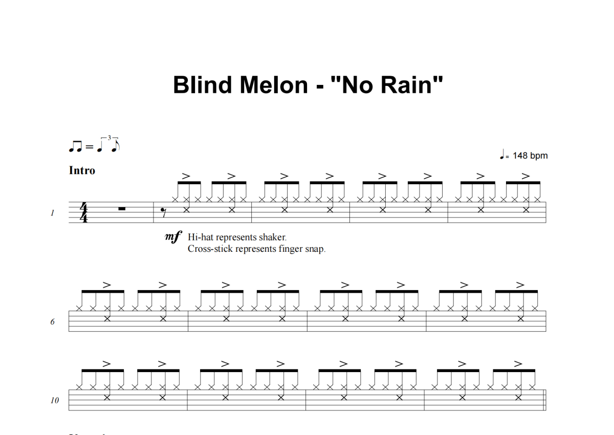 《No Rain》是Blind Melon演唱的一首歌曲,这份架子鼓谱共有四张高清图谱,图谱由 @失眠的土豆 编配上传,图谱使用五线谱编配,使用这份No Rain架子鼓谱,你将能够轻松地敲打出这首Blind Melon的No Rain,快来尝试吧。
