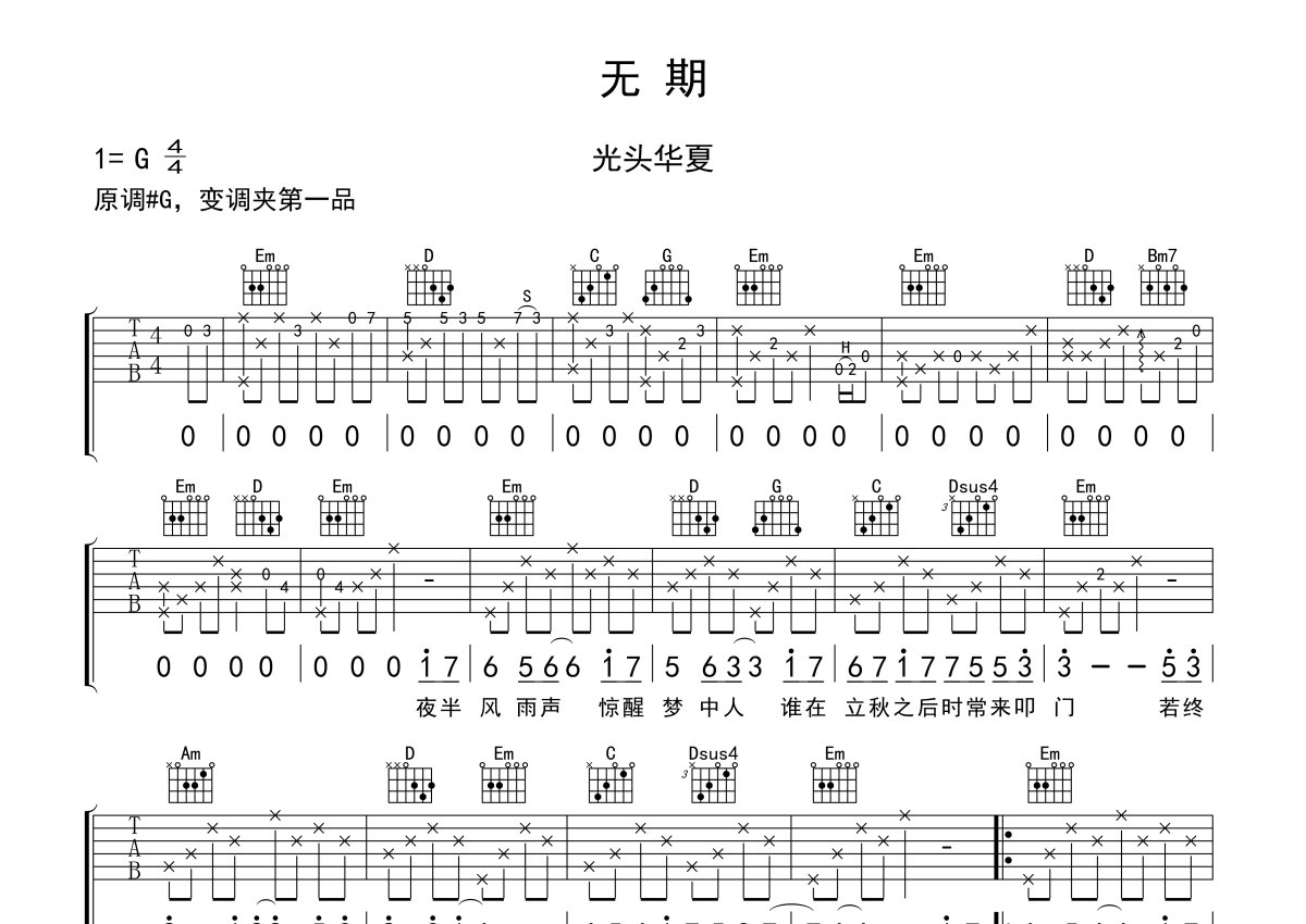 《无期》是光头华夏演唱的一首歌曲,本吉他谱采用的是G调指法编配,这份吉他谱共有两张高清图谱,图谱由 @吉他专家 编配上传,图谱使用六线谱编配,包含吉他和弦指法、简谱以及歌词部分,使用这份无期吉他谱,可以让你更加方便地掌握这首歌曲的弹唱技巧,快来尝试吧。无期吉他谱,光头华夏演唱,原调升G选用G调指法,变调夹夹一品位置。无期吉他弹唱谱,前奏间奏尾奏完整版,前路漫漫雨纷纷,谁在痴痴等……曾经的你是否也在苦苦守候一个人?抑或已经错过了那个痴痴等你的人?光头华夏用最真挚的歌声,向我们讲述属于一份纯粹却深沉的情感。