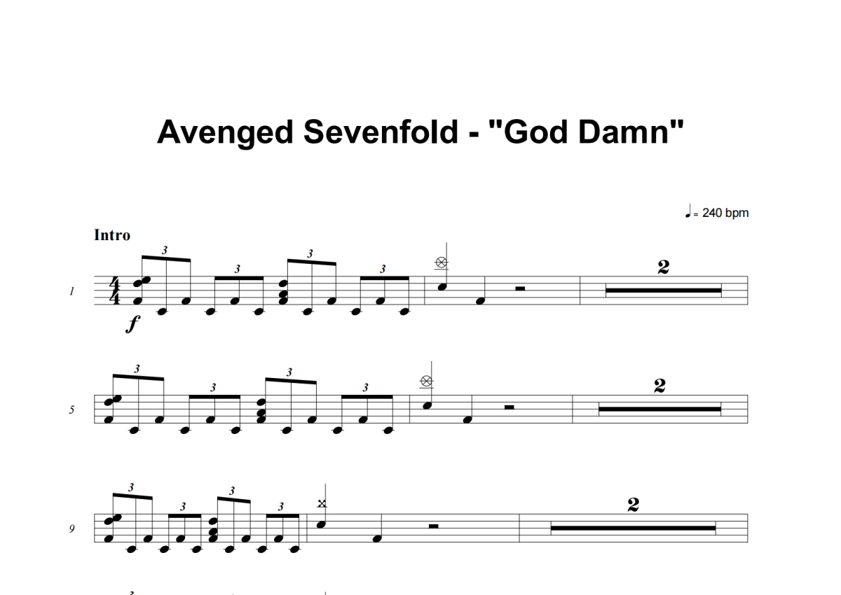 《God Damn》是Avenged Sevenfold演唱的一首歌曲,这份架子鼓谱共有七张高清图谱,图谱由 @失眠的土豆 编配上传,图谱使用五线谱编配,使用这份God Damn架子鼓谱,你将能够轻松地敲打出这首Avenged Sevenfold的God Damn,快来尝试吧。