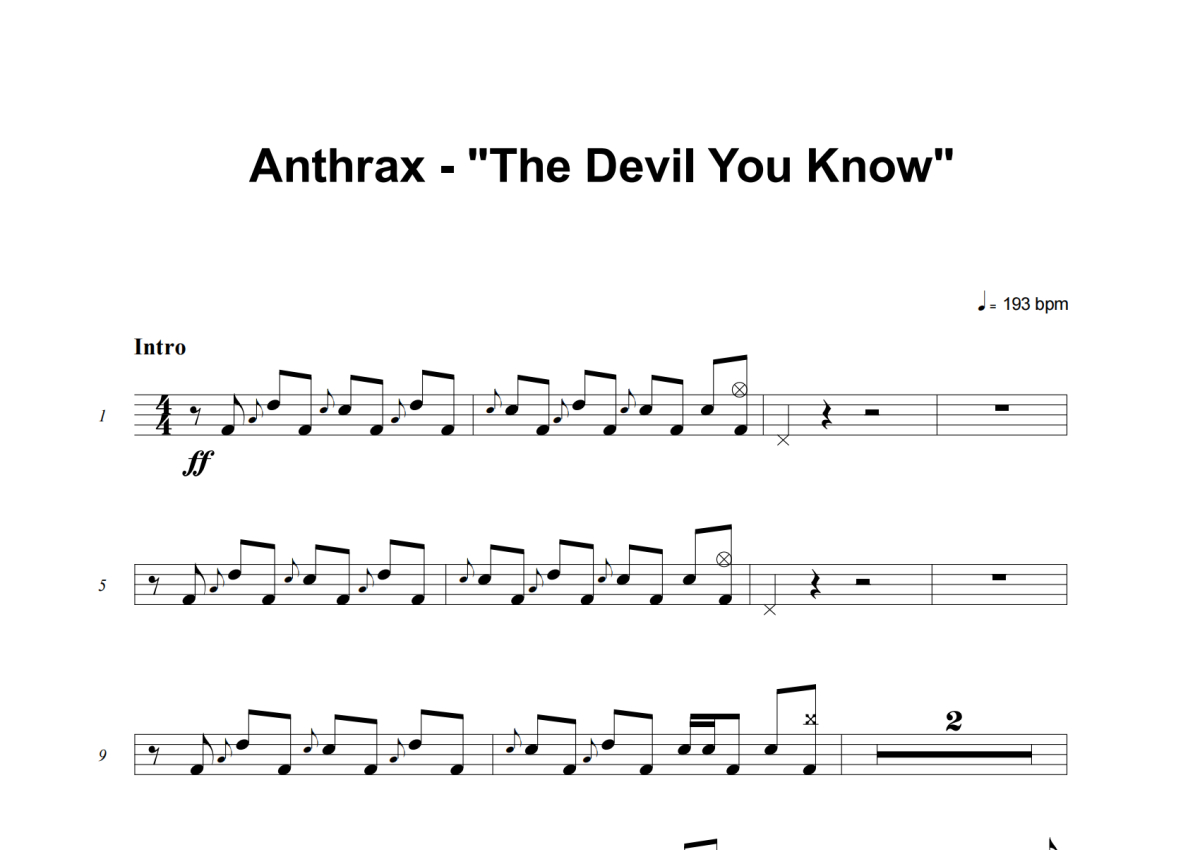 《The Devil You Know》是Anthrax演唱的一首歌曲,这份架子鼓谱共有七张高清图谱,图谱由 @失眠的土豆 编配上传,图谱使用五线谱编配,使用这份The Devil You Know架子鼓谱,你将能够轻松地敲打出这首Anthrax的The Devil You Know,快来尝试吧。