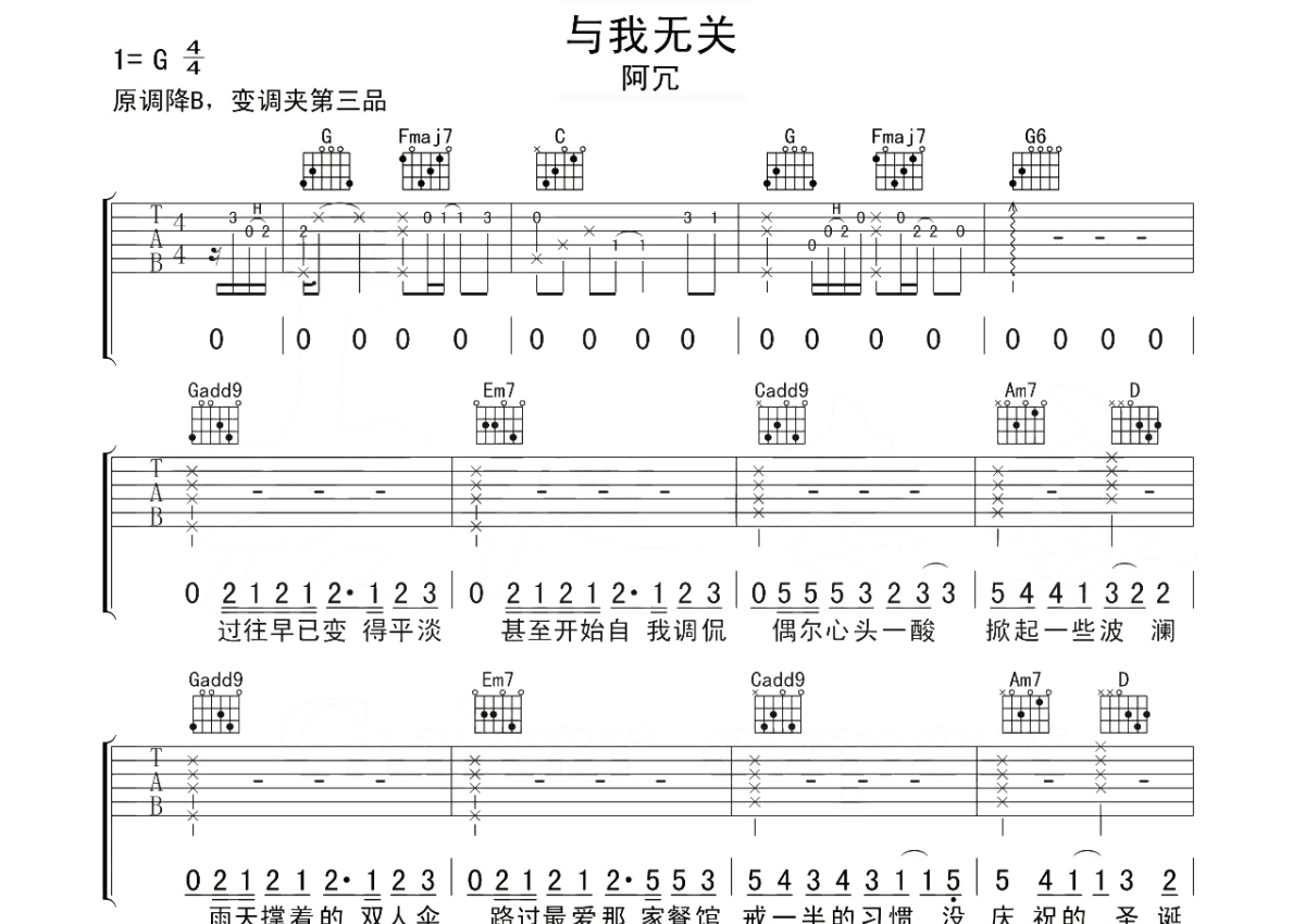 《与我无关》是阿冗演唱的一首歌曲,本吉他谱采用的是G调指法编配,这份吉他谱共有三张高清图谱,图谱由 @吉他专家 编配上传,图谱使用六线谱编配,包含吉他和弦指法、简谱以及歌词部分,使用这份与我无关吉他谱,可以让你更加方便地掌握这首歌曲的弹唱技巧,快来尝试吧。阿冗《与我无关》吉他谱,原调降B,选用G调指法,变调夹夹第三品。与《你的答案》不同,这是一首抒发自己的小情感的歌曲。唱出对于爱情的感叹,从期望到失望,最终接受现实,到自我调侃,习惯了自我孤单。于是爱情是惨淡还是灿烂,已经与自己无关。