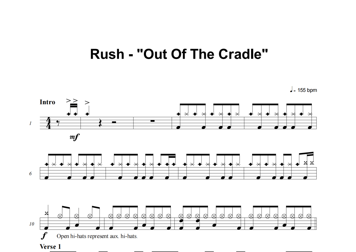 《Out Of The Cradle》是Rush演唱的一首歌曲,这份架子鼓谱共有七张高清图谱,图谱由 @失眠的土豆 编配上传,图谱使用五线谱编配,使用这份Out Of The Cradle架子鼓谱,你将能够轻松地敲打出这首Rush的Out Of The Cradle,快来尝试吧。