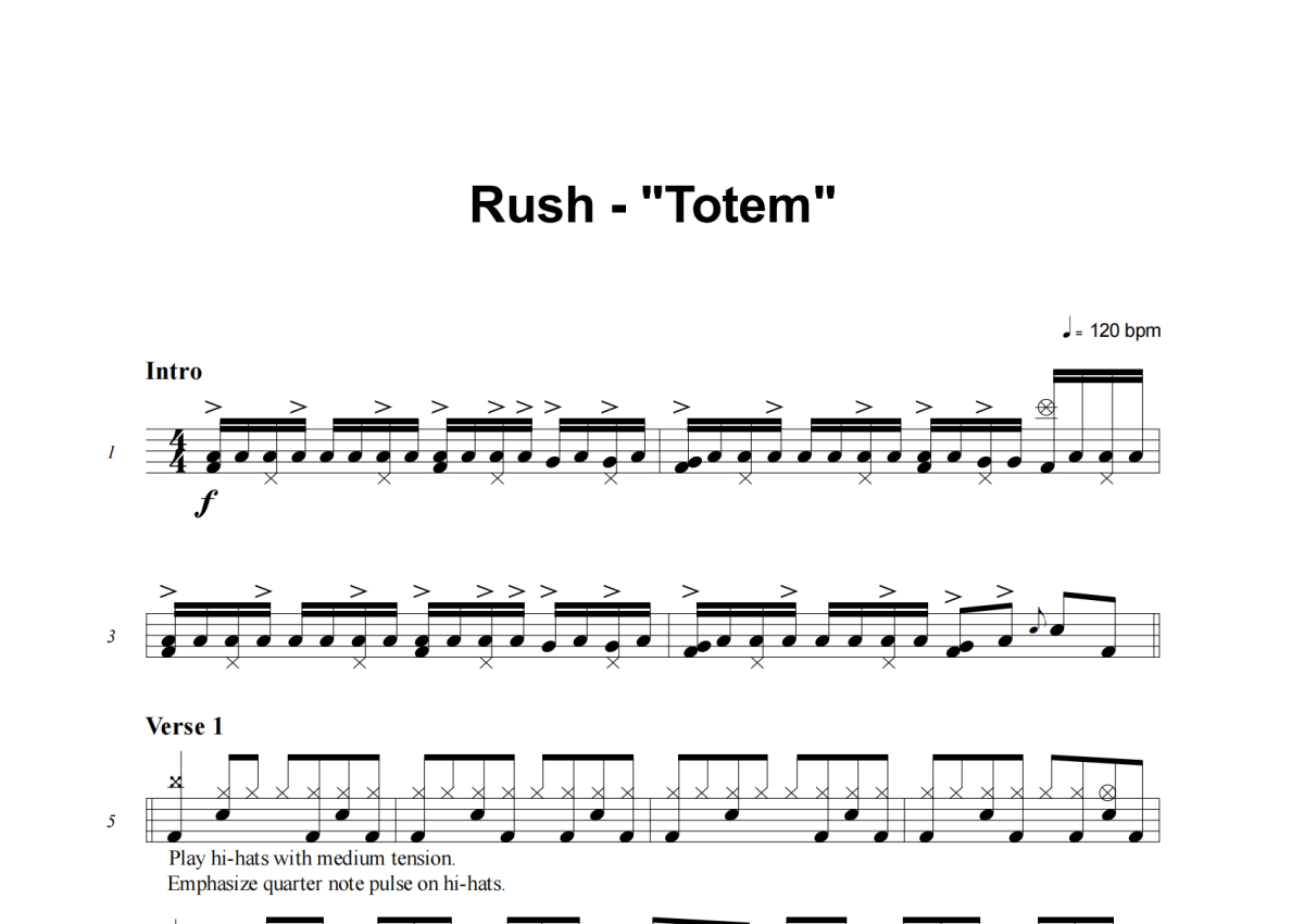 《Totem》是Rush演唱的一首歌曲,这份架子鼓谱共有七张高清图谱,图谱由 @失眠的土豆 编配上传,图谱使用五线谱编配,使用这份Totem架子鼓谱,你将能够轻松地敲打出这首Rush的Totem,快来尝试吧。
