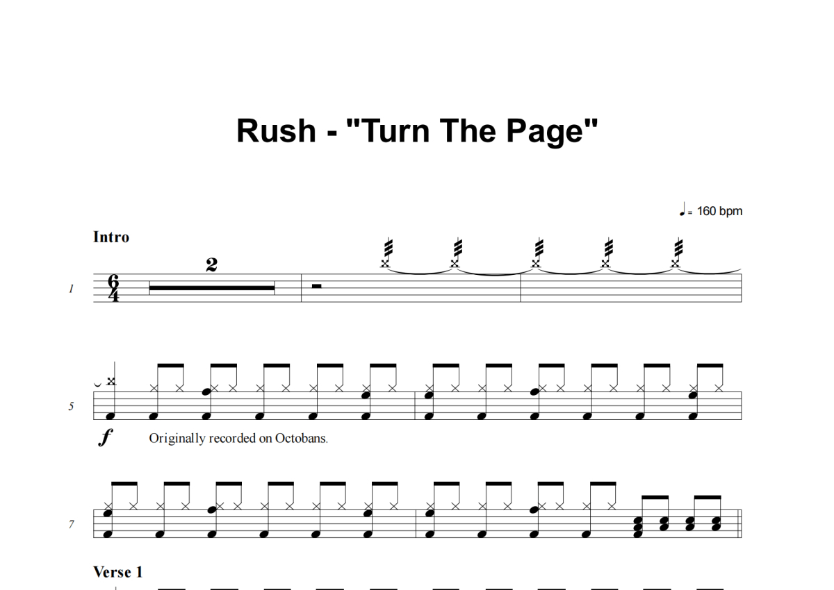 《Turn The Page》是Rush演唱的一首歌曲,这份架子鼓谱共有七张高清图谱,图谱由 @失眠的土豆 编配上传,图谱使用五线谱编配,使用这份Turn The Page架子鼓谱,你将能够轻松地敲打出这首Rush的Turn The Page,快来尝试吧。
