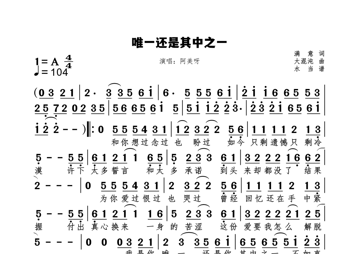 《唯一还是其中之一》是阿美呀演唱的一首歌曲,拍号为4/4拍,歌曲速度为每分钟104拍,这份简谱共有一张高清图谱,图谱由 @水当 编配上传原调A。