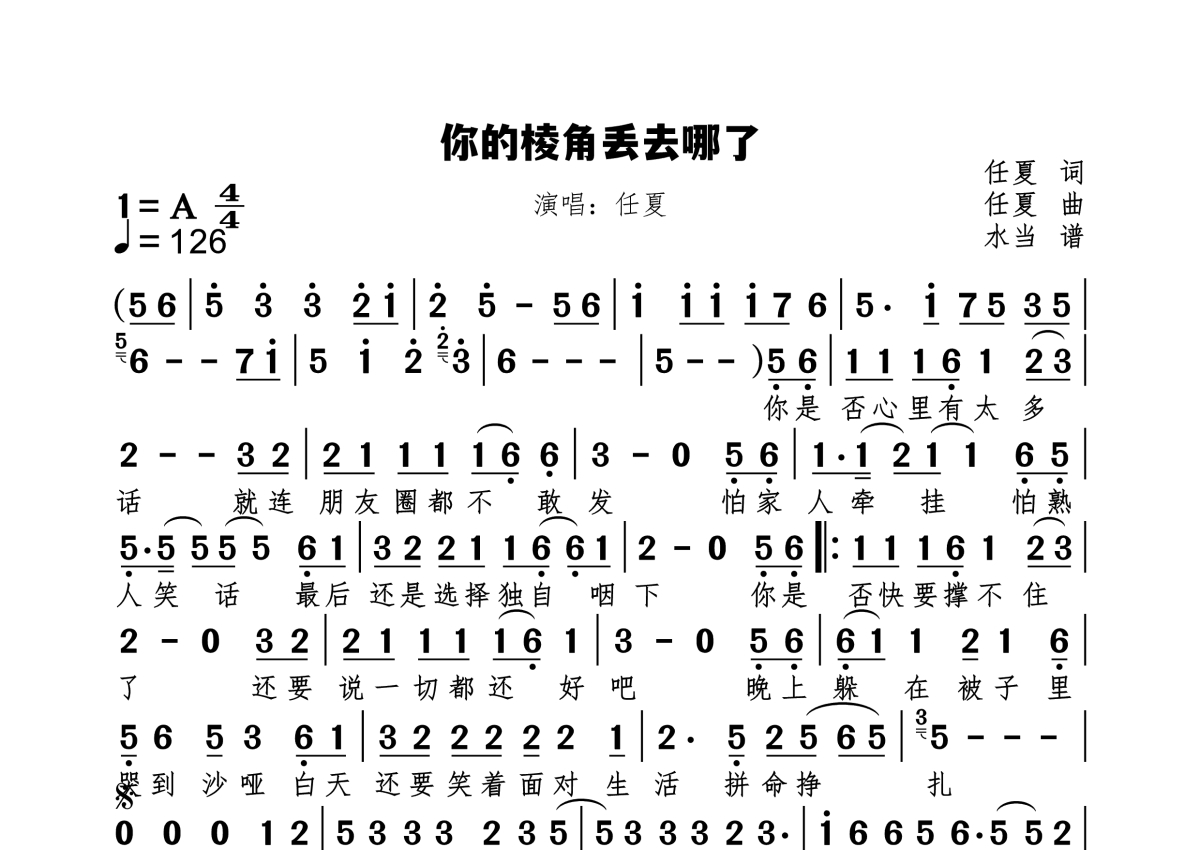 《你的棱角丢去哪了》是任夏演唱的一首歌曲,拍号为4/4拍,歌曲速度为每分钟126拍,这份简谱共有一张高清图谱,图谱由 @水当 编配上传原调A。