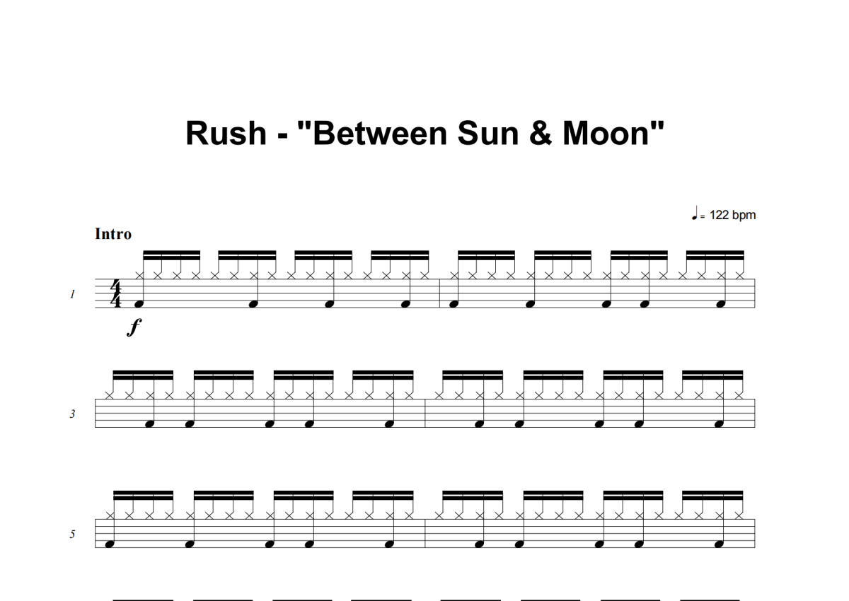 《Between Sun & Moon》是Rush演唱的一首歌曲,这份架子鼓谱共有七张高清图谱,图谱由 @失眠的土豆 编配上传,图谱使用五线谱编配,使用这份Between Sun & Moon架子鼓谱,你将能够轻松地敲打出这首Rush的Between Sun & Moon,快来尝试吧。