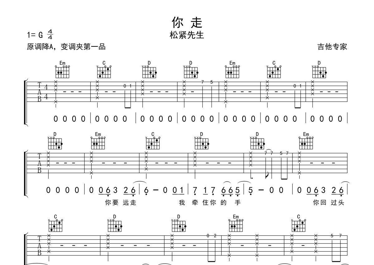 松紧先生《你走》吉他谱 - G调弹唱六线谱