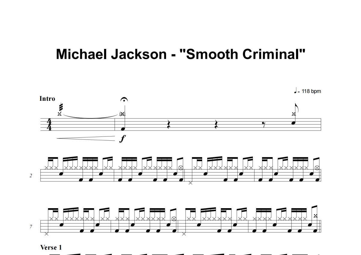 《Smooth Criminal》是Michael Jackson演唱的一首歌曲,这份架子鼓谱共有四张高清图谱,图谱由 @失眠的土豆 编配上传,图谱使用五线谱编配,使用这份Smooth Criminal架子鼓谱,你将能够轻松地敲打出这首Michael Jackson的Smooth Criminal,快来尝试吧。