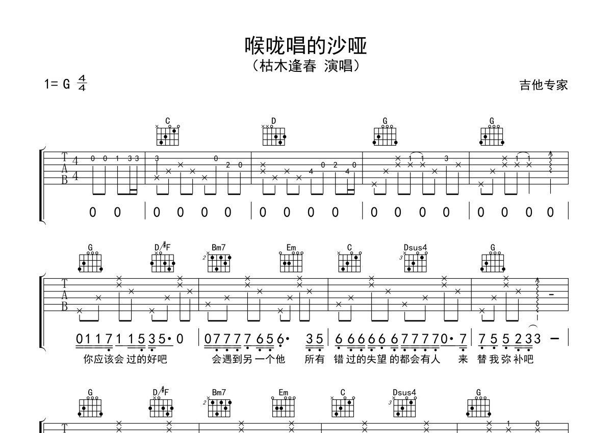 枯木逢春《喉咙唱的沙哑》吉他谱 - G调弹唱六线谱