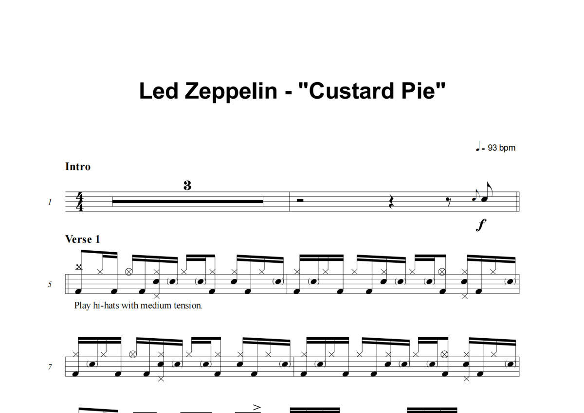 《Custard Pie》是Led Zeppelin演唱的一首歌曲,这份架子鼓谱共有六张高清图谱,图谱由 @失眠的土豆 编配上传,图谱使用五线谱编配,使用这份Custard Pie架子鼓谱,你将能够轻松地敲打出这首Led Zeppelin的Custard Pie,快来尝试吧。