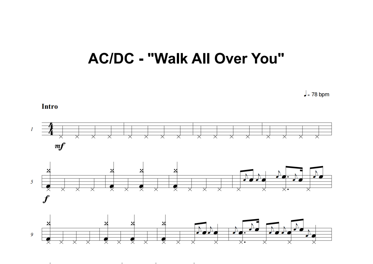 《Walk All Over You》是AC_DC演唱的一首歌曲,这份架子鼓谱共有六张高清图谱,图谱由 @失眠的土豆 编配上传,图谱使用五线谱编配,使用这份Walk All Over You架子鼓谱,你将能够轻松地敲打出这首AC_DC的Walk All Over You,快来尝试吧。