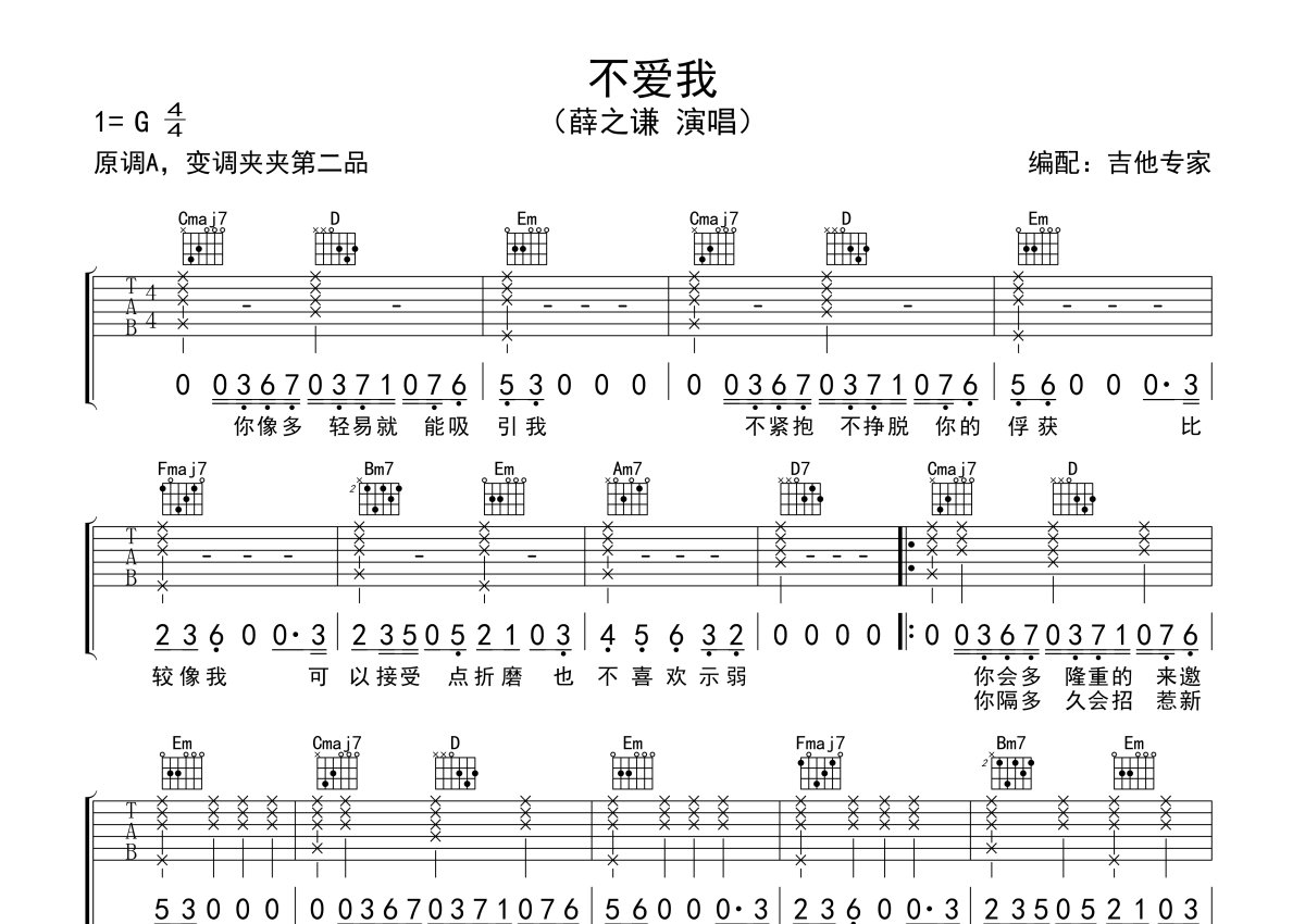 《不爱我》是薛之谦演唱的一首歌曲,本吉他谱采用的是G调指法编配,这份吉他谱共有一张高清图谱,图谱由 @吉他专家 编配上传,图谱使用六线谱编配,包含吉他和弦指法、简谱以及歌词部分,使用这份不爱我吉他谱,可以让你更加方便地掌握这首歌曲的弹唱技巧,快来尝试吧。薛之谦演唱的新歌,原调A,选用G调指法,变调夹夹第二品。不爱我吉他弹唱谱,一份简单的吉他谱,键盘伴奏改编过来的。感谢关注打谱啦网。带有薛氏苦情歌风格的一首作品,唱出不被爱的卑微和执着,低吟的旋律,纠结的心绪,爱与不爱的折磨,明知故问的坚持自我,层层无从摆脱的内心波折。