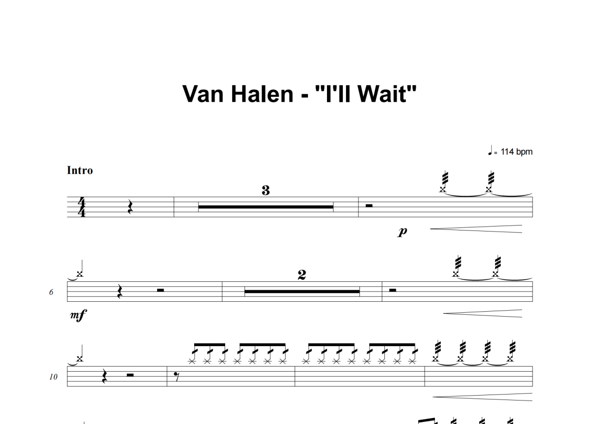 《I'll Wait》是Van Halen演唱的一首歌曲,这份架子鼓谱共有四张高清图谱,图谱由 @失眠的土豆 编配上传,图谱使用五线谱编配,使用这份I'll Wait架子鼓谱,你将能够轻松地敲打出这首Van Halen的I'll Wait,快来尝试吧。