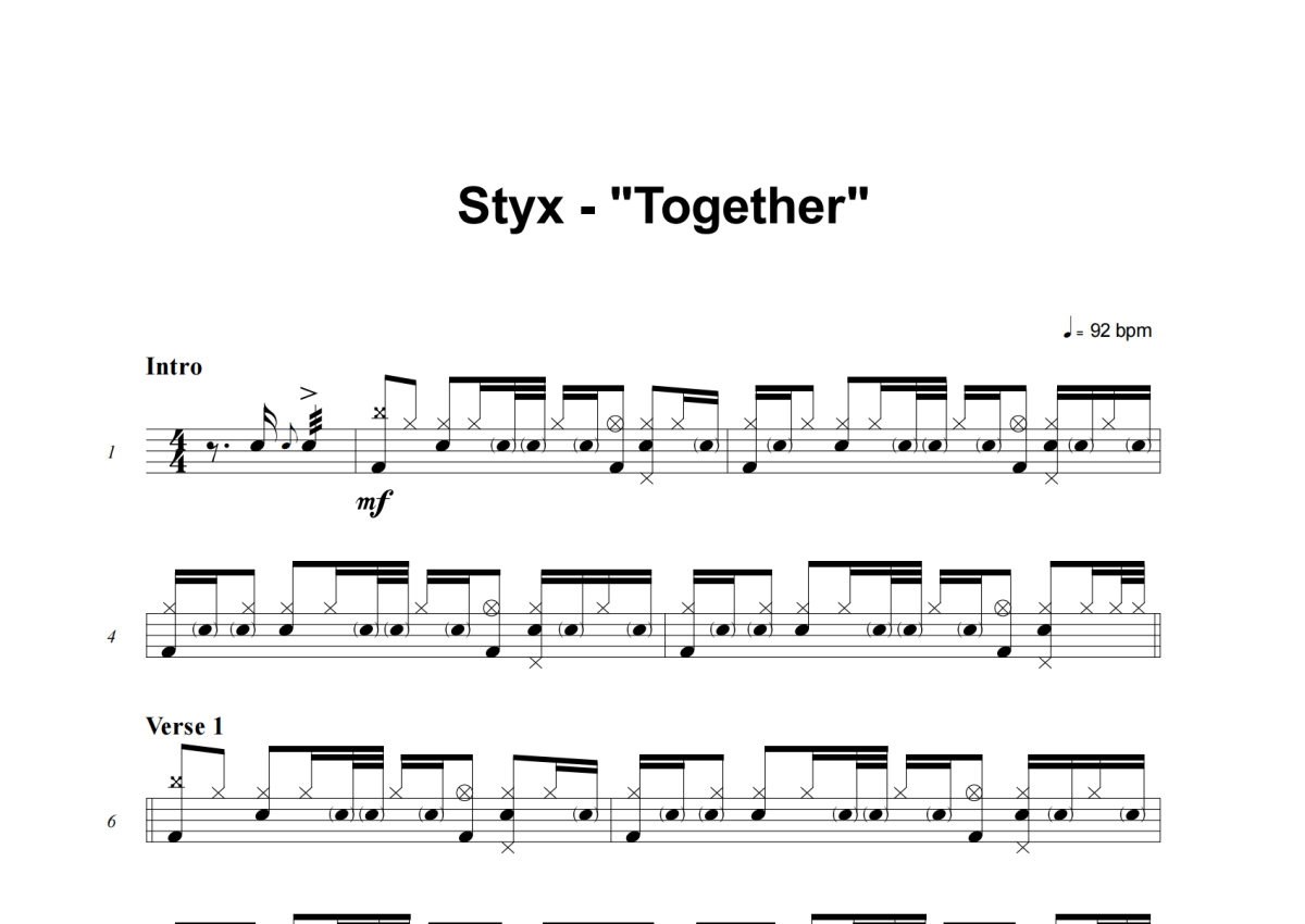 《Together》是Styx演唱的一首歌曲,这份架子鼓谱共有六张高清图谱,图谱由 @失眠的土豆 编配上传,图谱使用五线谱编配,使用这份Together架子鼓谱,你将能够轻松地敲打出这首Styx的Together,快来尝试吧。