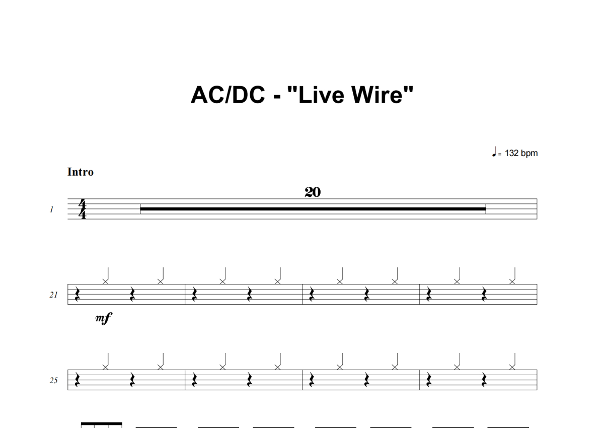 《Live Wire》是AC_DC演唱的一首歌曲,这份架子鼓谱共有五张高清图谱,图谱由 @失眠的土豆 编配上传,图谱使用五线谱编配,使用这份Live Wire架子鼓谱,你将能够轻松地敲打出这首AC_DC的Live Wire,快来尝试吧。