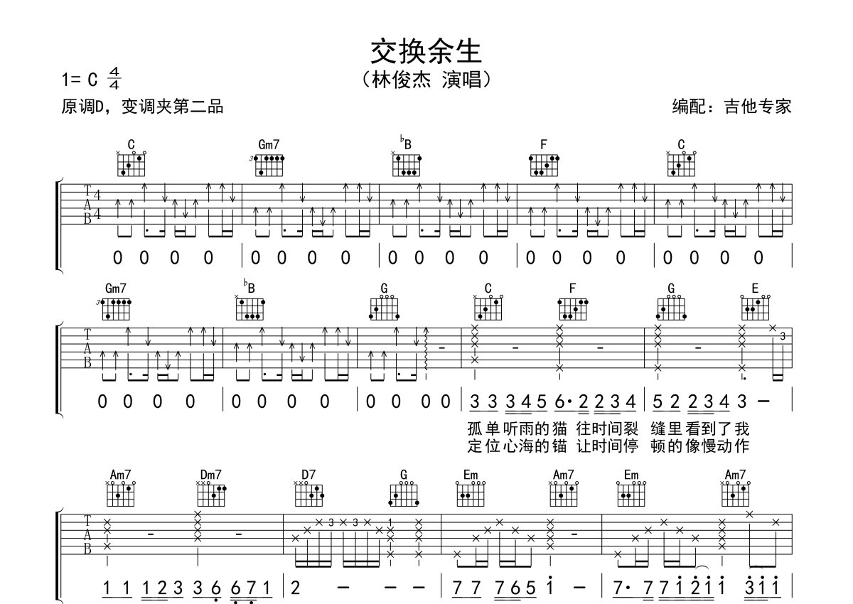 林俊杰《交换余生》吉他谱 - C调弹唱六线谱
