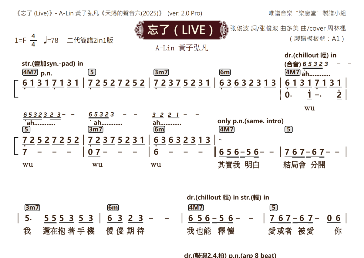 A-Lin 黃子弘凡《忘了(live)》乐队总谱 - 2.0版2in1专业团谱