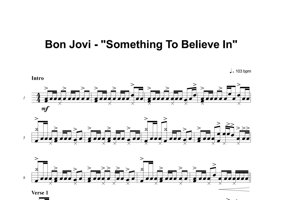 《Something To Believe In》是Bon Jovi演唱的一首歌曲,这份架子鼓谱共有八张高清图谱,图谱由 @庄颜 编配上传,图谱使用五线谱编配,使用这份Something To Believe In架子鼓谱,你将能够轻松地敲打出这首Bon Jovi的Something To Believe In,快来尝试吧。