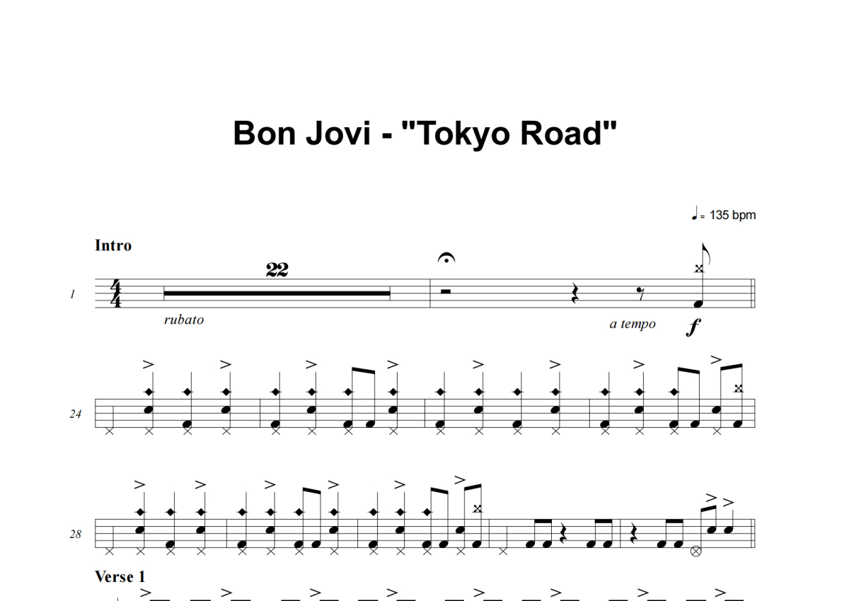 《Tokyo Road》是Bon Jovi演唱的一首歌曲,这份架子鼓谱共有六张高清图谱,图谱由 @庄颜 编配上传,图谱使用五线谱编配,使用这份Tokyo Road架子鼓谱,你将能够轻松地敲打出这首Bon Jovi的Tokyo Road,快来尝试吧。