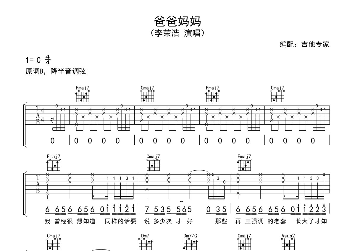 李荣浩《爸爸妈妈》吉他谱 - C调弹唱六线谱