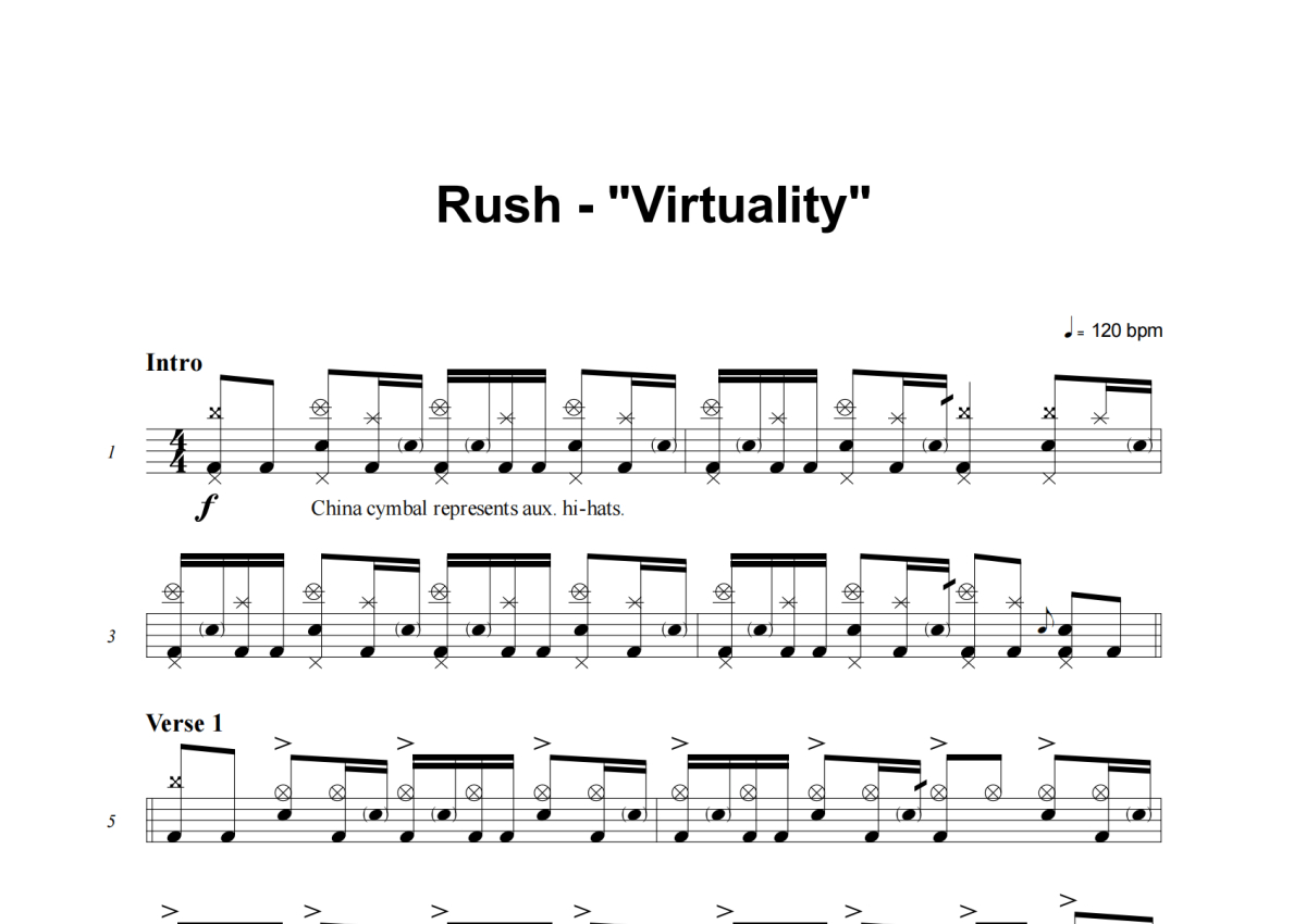 《Virtuality》是Rush演唱的一首歌曲,这份架子鼓谱共有十张高清图谱,图谱由 @庄颜 编配上传,图谱使用五线谱编配,使用这份Virtuality架子鼓谱,你将能够轻松地敲打出这首Rush的Virtuality,快来尝试吧。