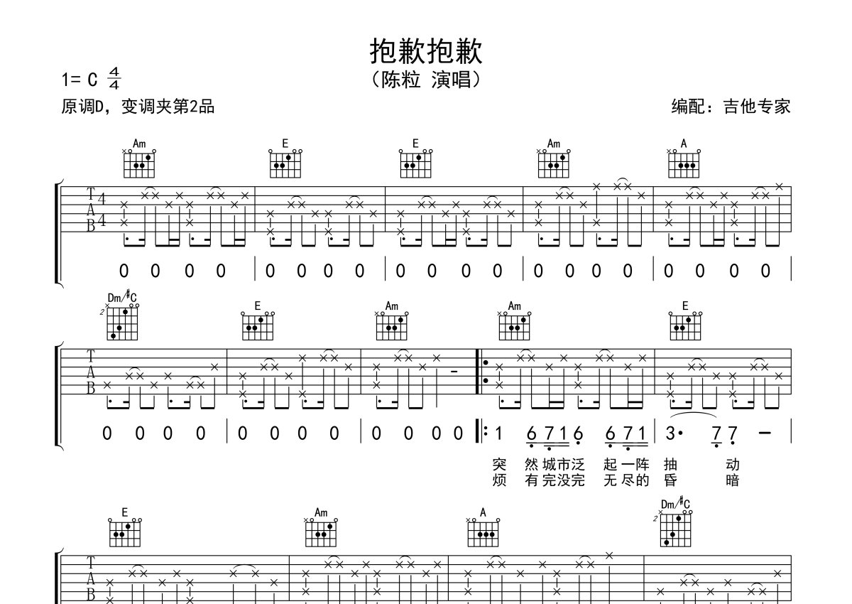 陈粒《抱歉抱歉》吉他谱 - C调弹唱六线谱