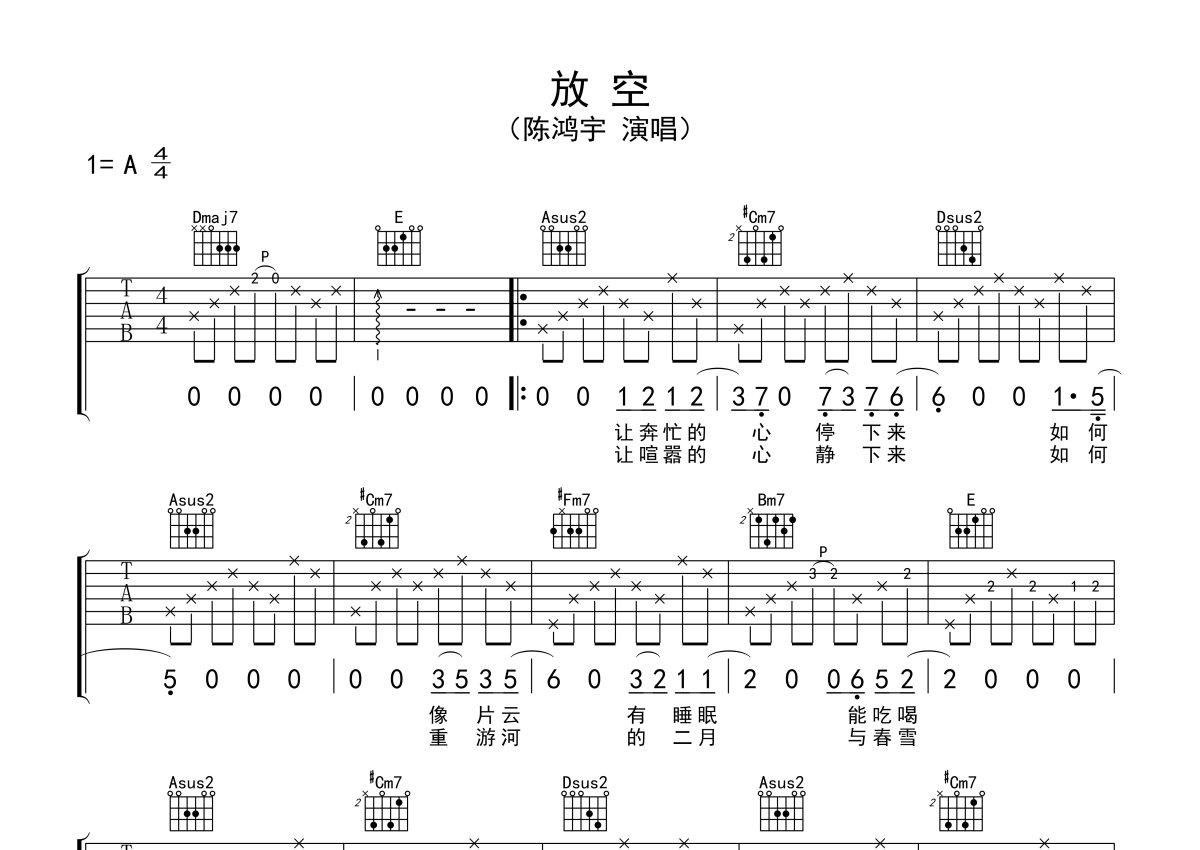 陈鸿宇《放空》吉他谱 - A调弹唱六线谱