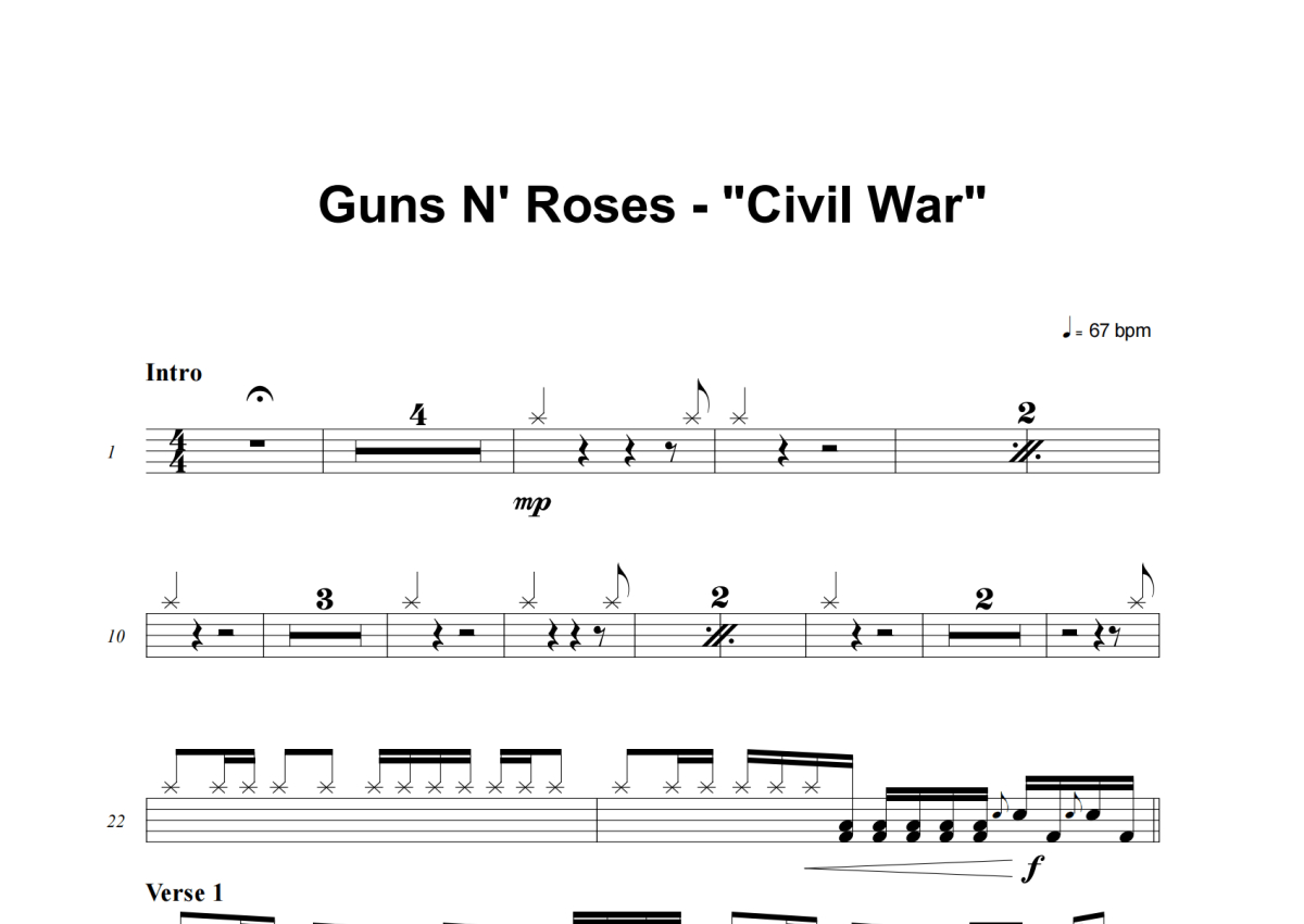 《Civil War》是Guns N' Roses演唱的一首歌曲,这份架子鼓谱共有七张高清图谱,图谱由 @庄颜 编配上传,图谱使用五线谱编配,使用这份Civil War架子鼓谱,你将能够轻松地敲打出这首Guns N' Roses的Civil War,快来尝试吧。